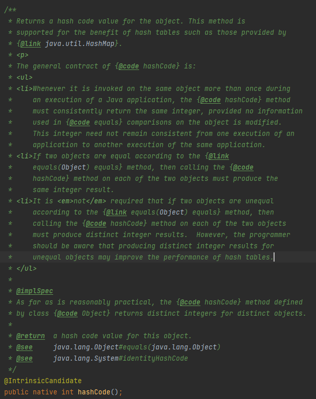 hash의 경우, key로 전달받은 값을 Object class에 존재하는 hashCode를 통해 객체의 해시 코드 값을 리턴합니다. Object class의 hashCode의 경우 java 버전에 따라 내용이 조금 다른데, java 13부터 아래와 같이 변경되었습니다.